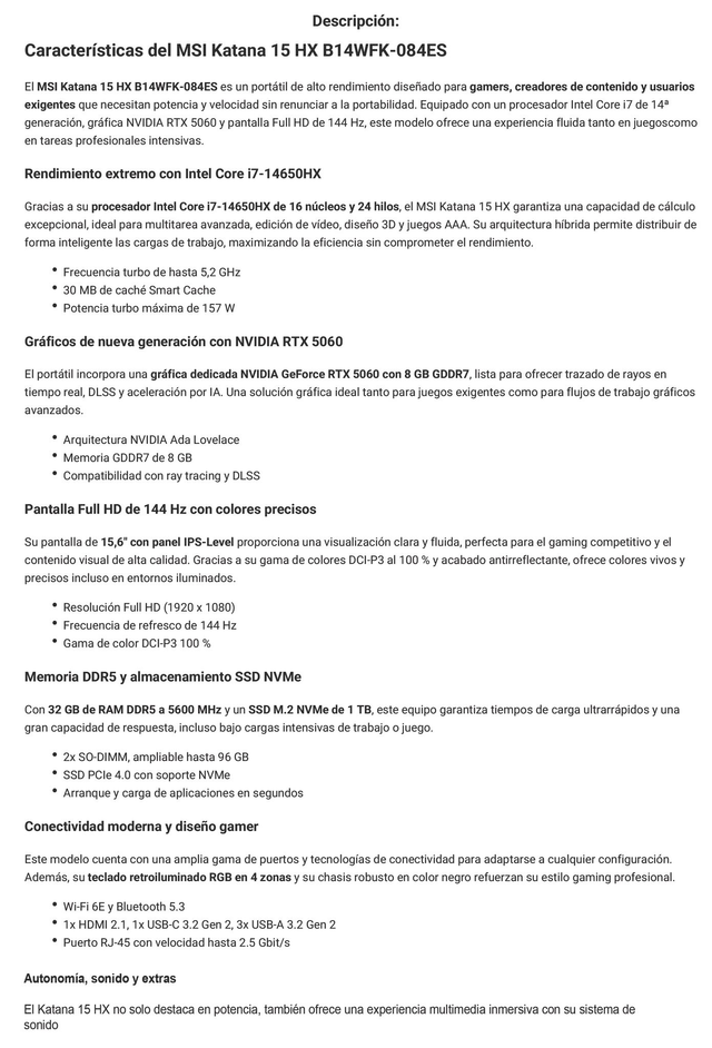 El MSI Katana 15 HX B14WFK-084ES es un portátil de alto rendimiento diseñado para gamers, creadores de contenido y usuarios